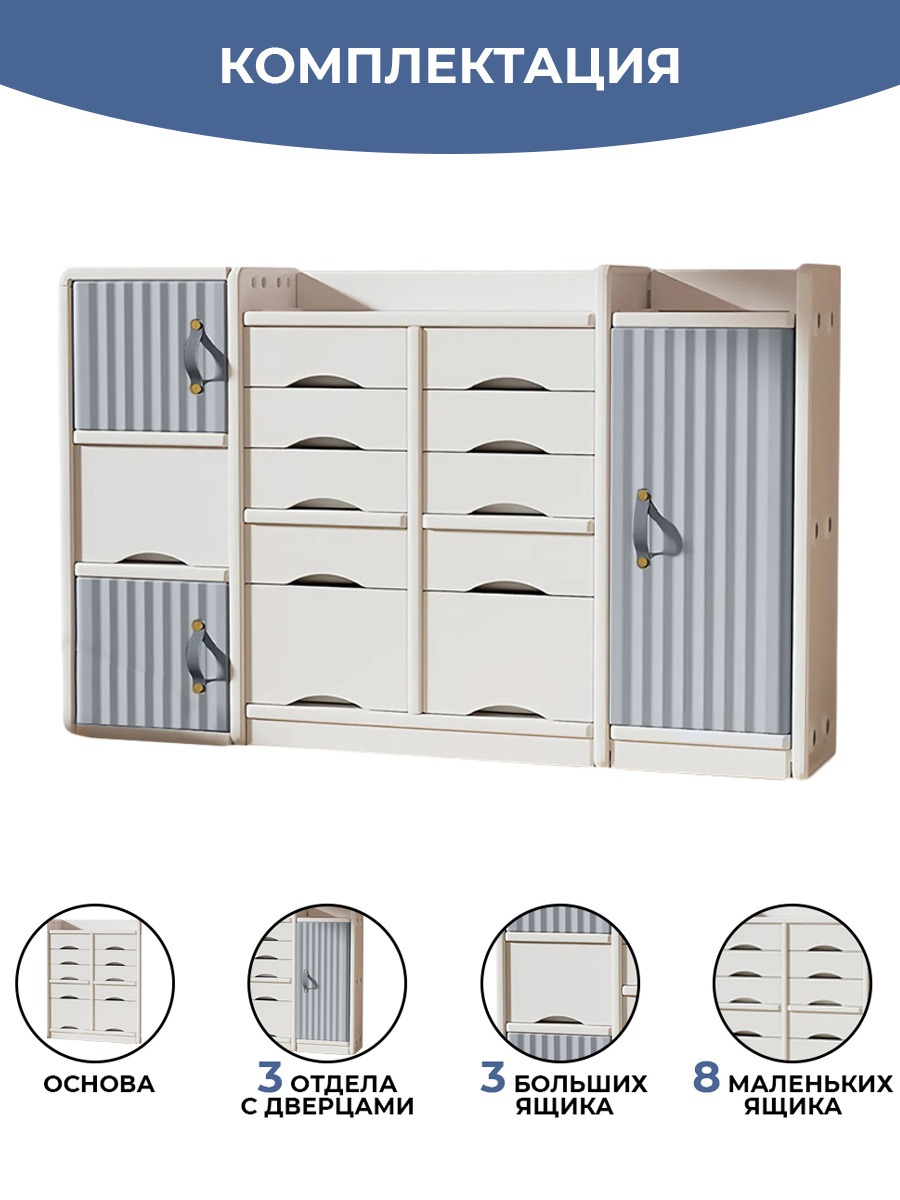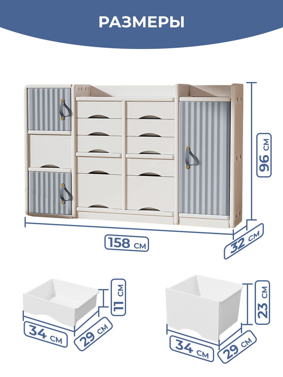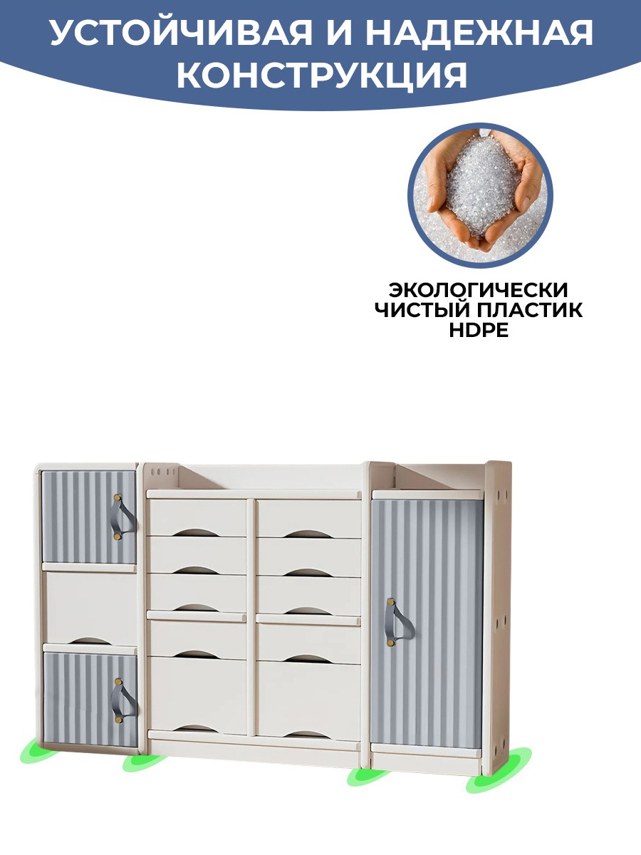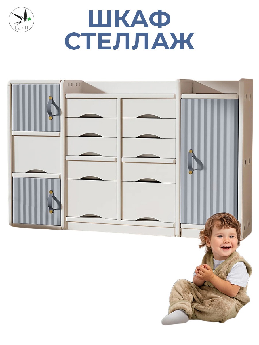 Новый стеллаж в детскую комнату LESTI RIF - это не только удобное решение для хранения игрушек, вещей и книг, но и стильный элемент мебели в детской комнате. Размером 158х32х96 см, этот стеллаж легко впишется в любой интерьер. Он имеет 3 больших ящика (34х29х23см.), 8 маленьких (34х29х11см.) и 3 полки с рифлёными дверцами разных размеров. Под ящиками есть фиксатор от падения. Сборка шкафа для игрушек быстрая и простая, вертикальные секции стеллажа можно соединять между собой в любом порядке. Нейтральный бело-серый оттенок стеллажа для игрушек с акцентной полоской на дверцах, придают ему стильный и современный вид. Наш детский шкаф изготовлен из экологически чистого пластика HDPE, имеет закругленные углы, что гарантирует безопасность вашему ребенку. Подарите своему малышу радость и уют - выберите наш детский стеллаж LESTI RIF!