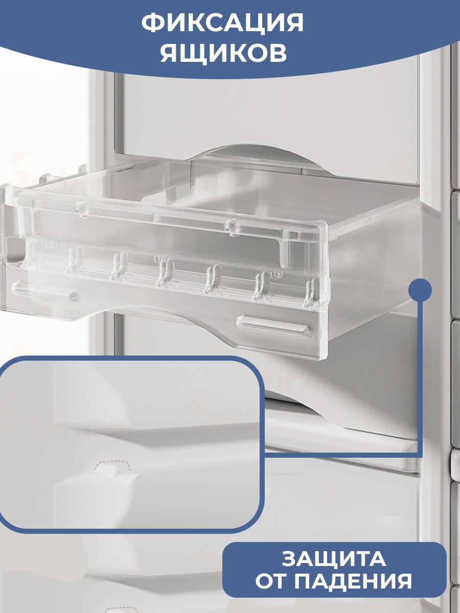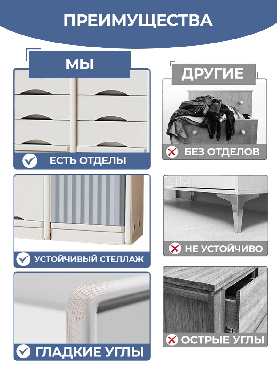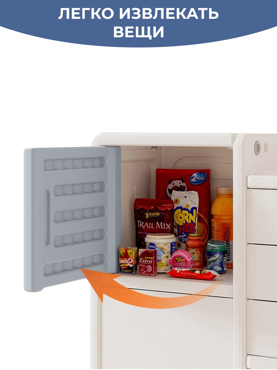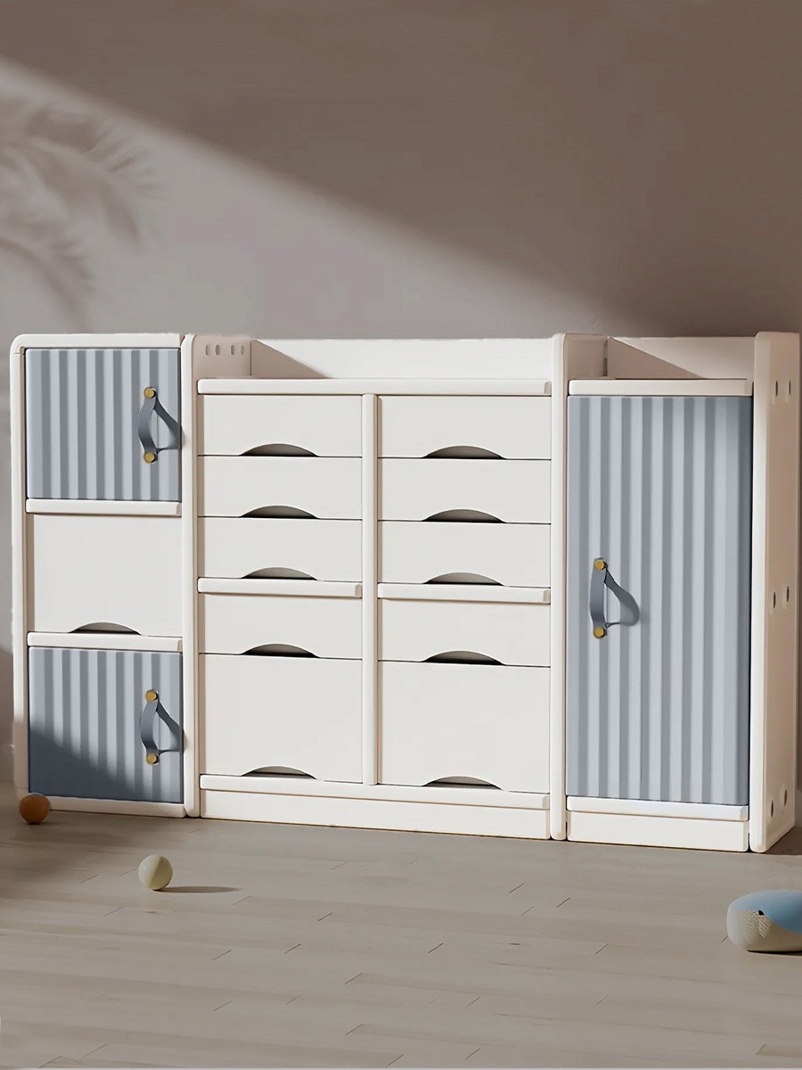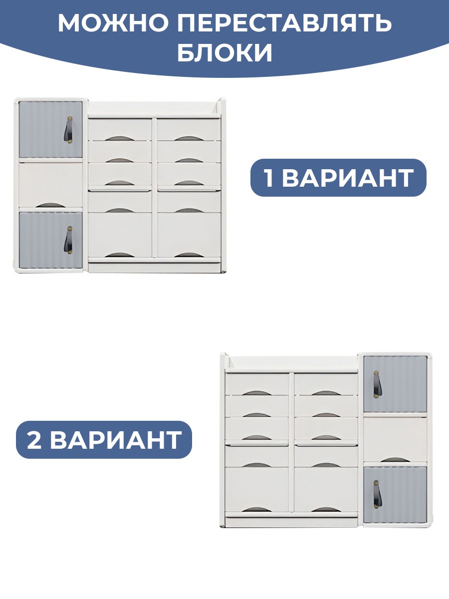 Новый стеллаж в детскую комнату LESTI RIF - это не только удобное решение для хранения игрушек, вещей и книг, но и стильный элемент мебели в детской комнате. Размером 158х32х96 см, этот стеллаж легко впишется в любой интерьер. Он имеет 3 больших ящика (34х29х23см.), 8 маленьких (34х29х11см.) и 3 полки с рифлёными дверцами разных размеров. Под ящиками есть фиксатор от падения. Сборка шкафа для игрушек быстрая и простая, вертикальные секции стеллажа можно соединять между собой в любом порядке. Нейтральный бело-серый оттенок стеллажа для игрушек с акцентной полоской на дверцах, придают ему стильный и современный вид. Наш детский шкаф изготовлен из экологически чистого пластика HDPE, имеет закругленные углы, что гарантирует безопасность вашему ребенку. Подарите своему малышу радость и уют - выберите наш детский стеллаж LESTI RIF!
