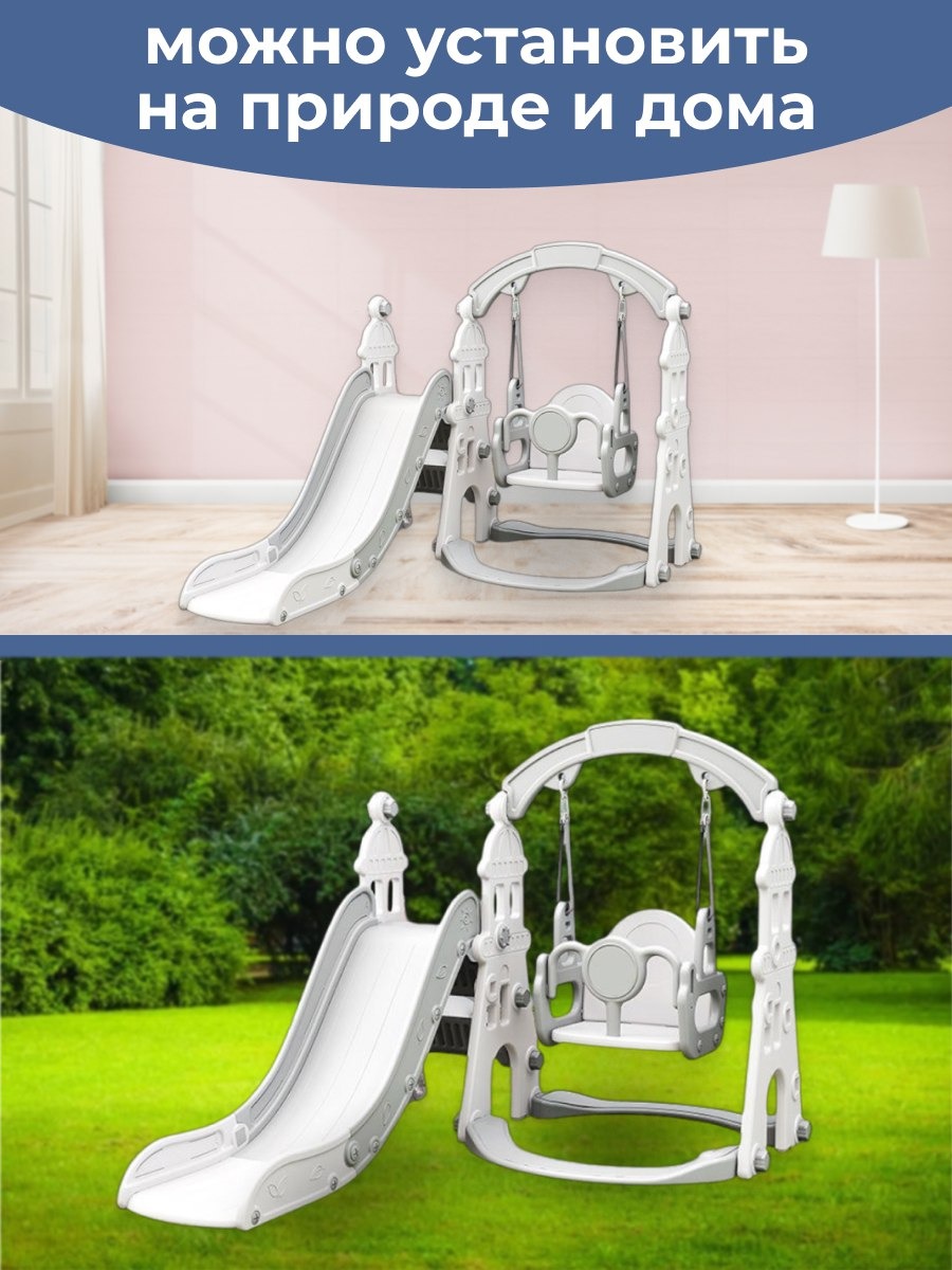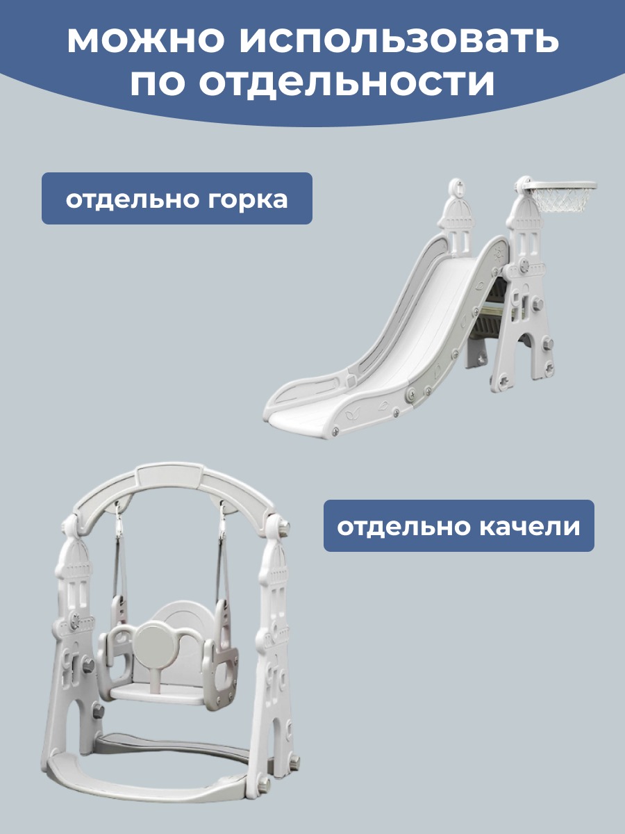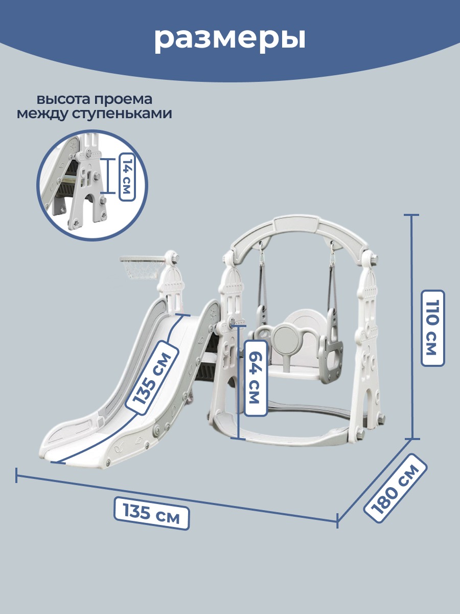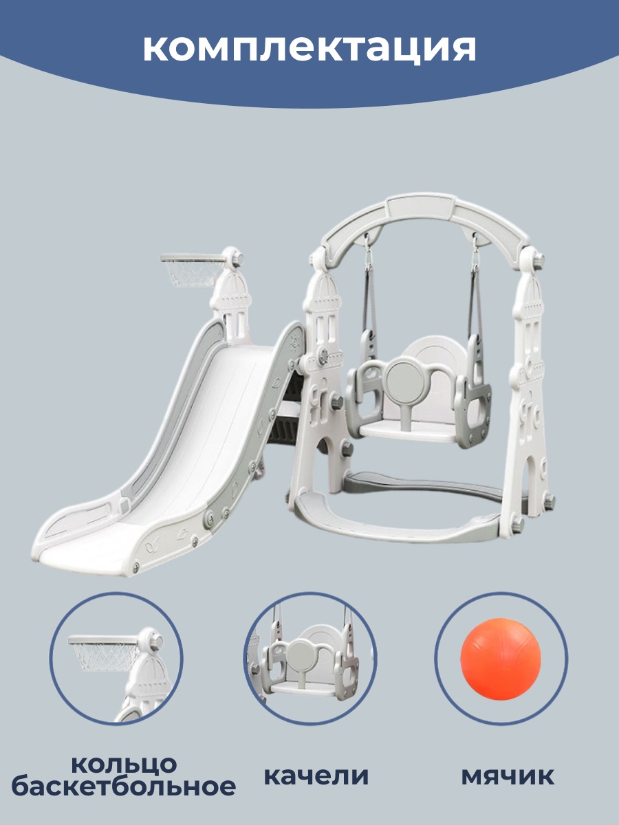 Размер комплекса 180*135*110см. Комплекс в форме замка будет отличным подарком на любой праздник, так как он предоставляет множество возможностей для активных и увлекательных игр. Кроме того, его можно использовать по отдельности - собрать только горку или качели - в зависимости от предпочтений и потребностей детей. Удобный и плавный спуск позволит детям получить максимум удовольствия. Ступеньки с выпуклым рисунком обеспечат безопасный подъем для детей. В состав комплекса входит баскетбольное кольцо, которое добавит спортивный элемент в игру и поможет развить моторику и координацию движений у детей.