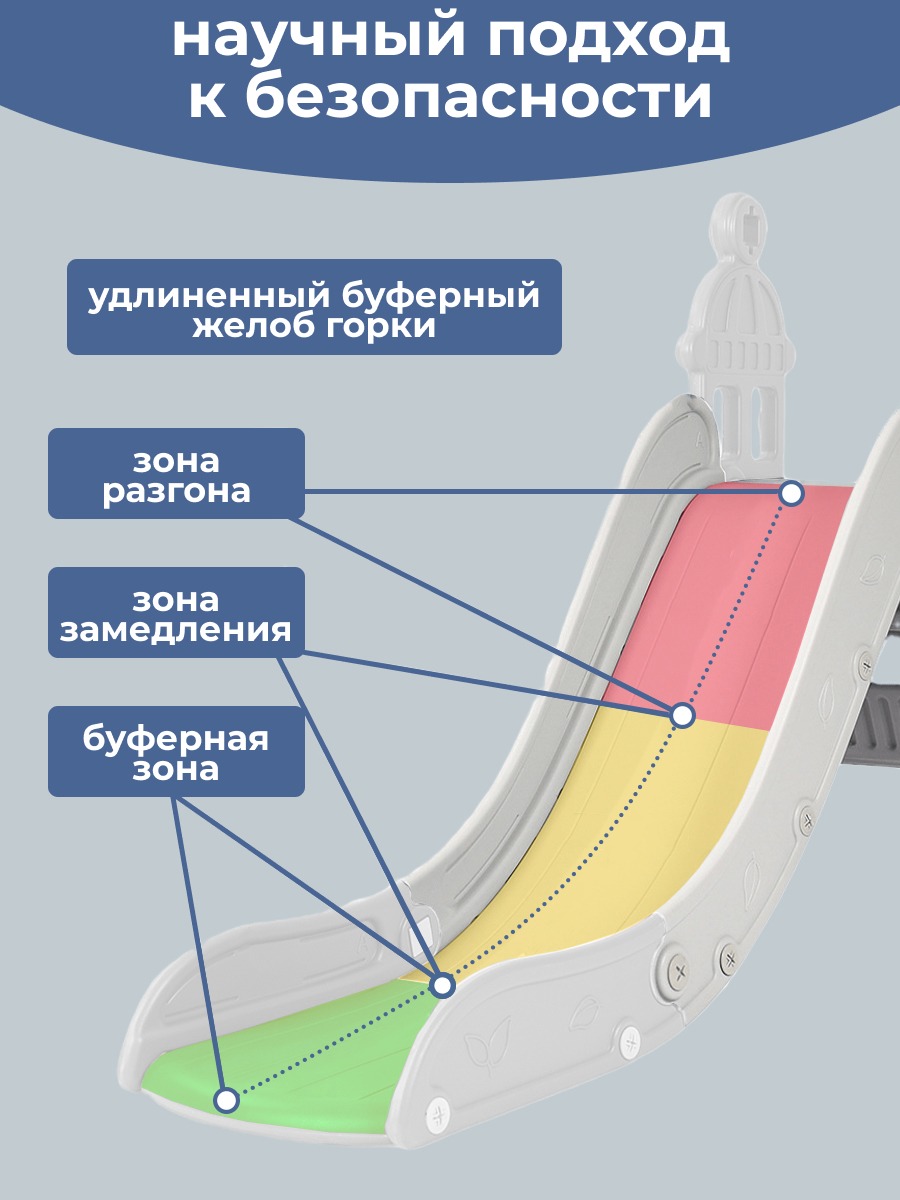 Для максимальной устойчивости конструкции, в основание комплекса можно залить воду. Это гарантирует надежность и безопасность даже при самых активных играх. Широкое нижнее основание и резиновые ножки обеспечивают устойчивость комплекса, позволяя детям наслаждаться игрой и весельем без каких-либо опасений. Комплекс также оснащен качелями с защитным бортиком, которые предназначены для самых маленьких детей. А когда они подрастут, бортик можно снять, чтобы дать им больше свободы и возможности наслаждаться игрой.