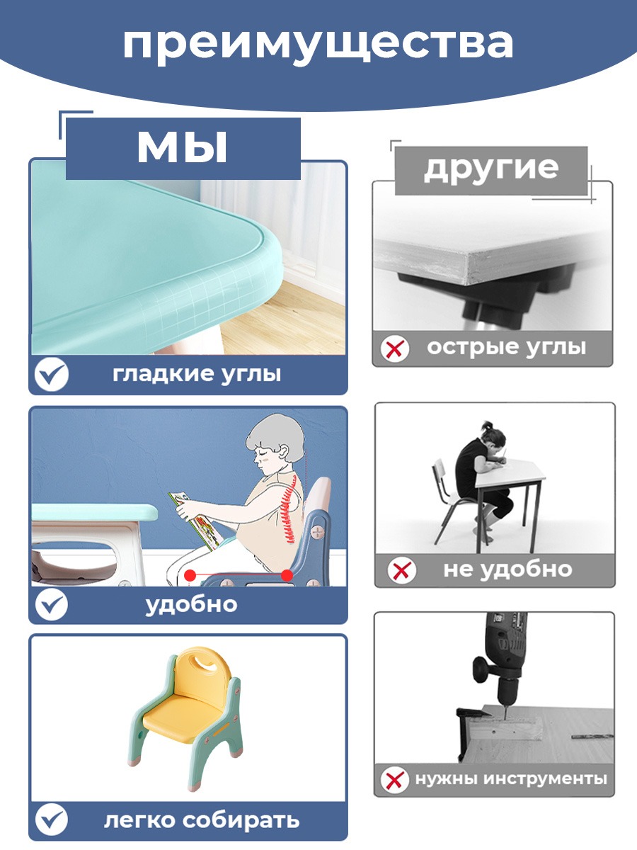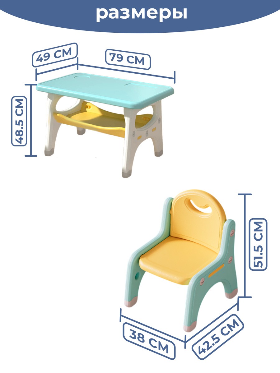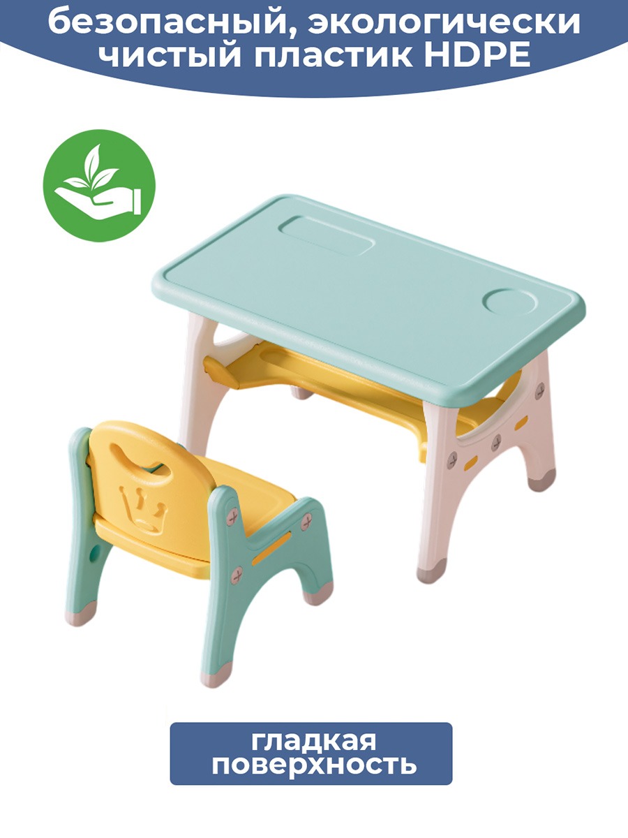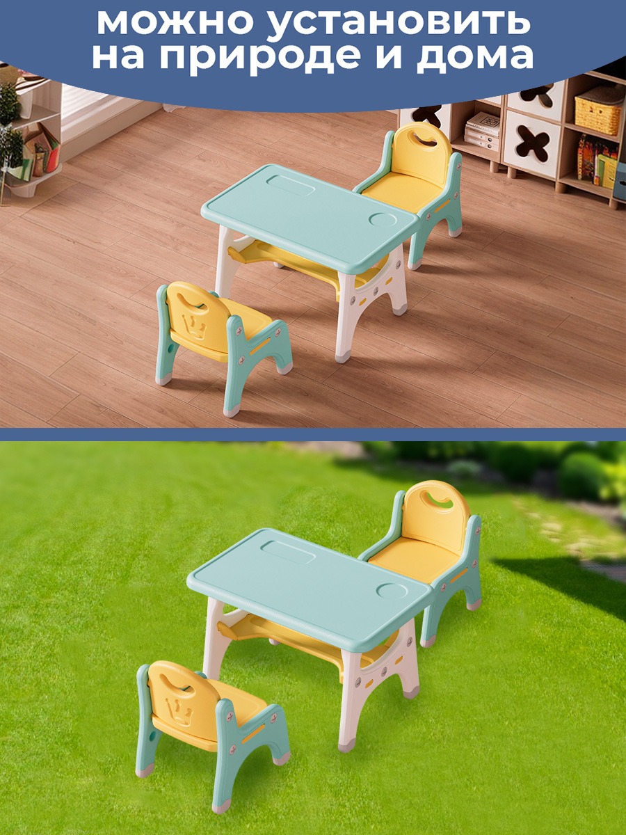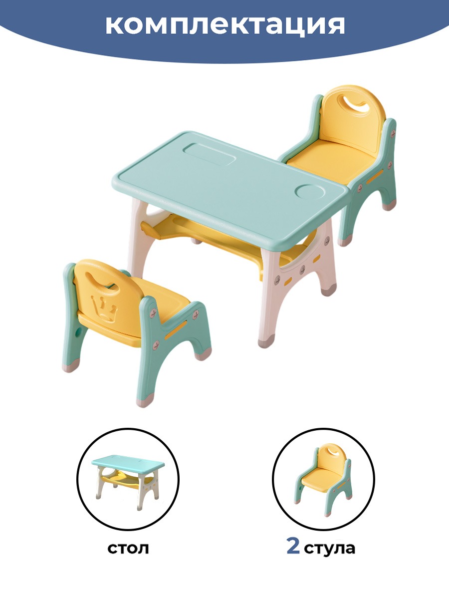 Наш набор из столика и двух стульчиков - это надежное, удобное и безопасное решение для вашего ребенка. Позвольте ему наслаждаться играми, обучением и приемом пищи в комфортной и яркой обстановке!