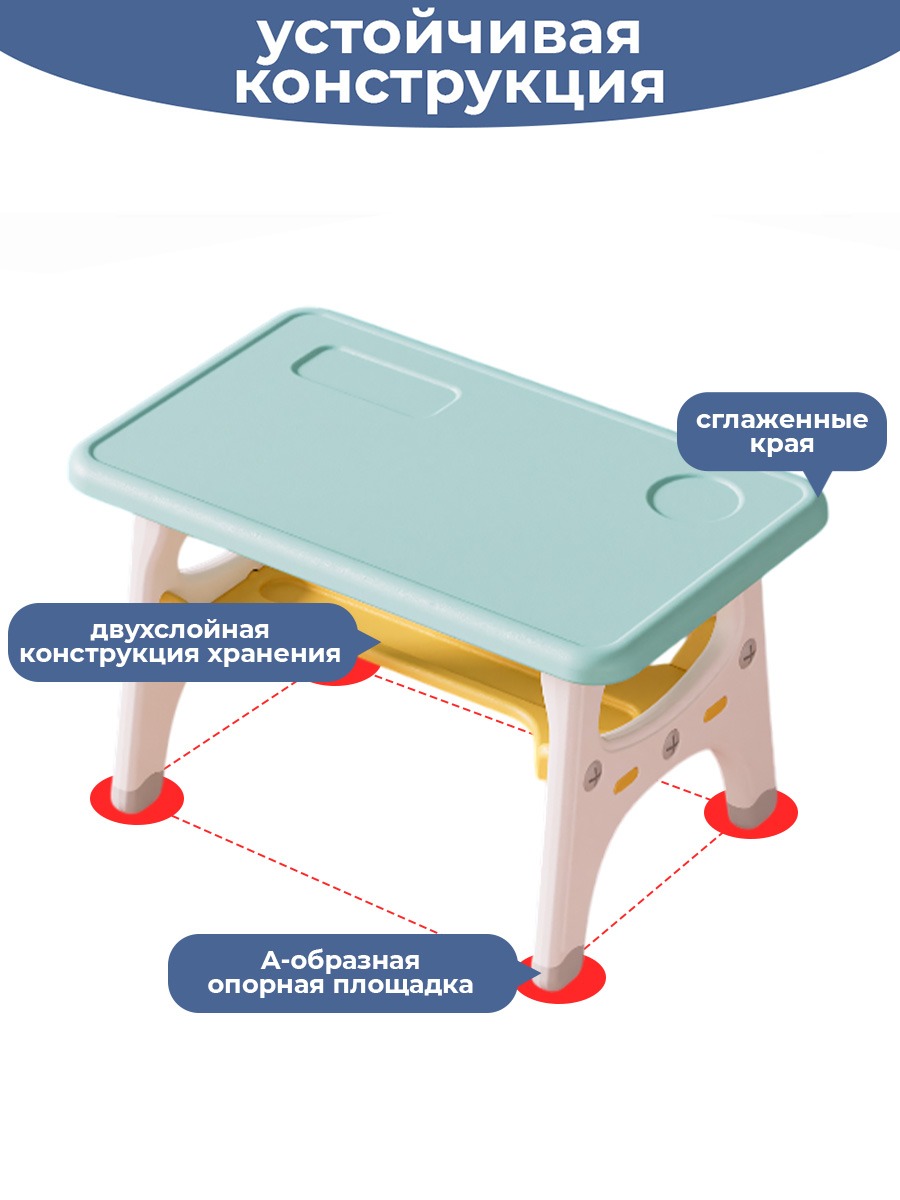 Прочная сборная конструкция столика гарантирует его долговечность и надежность. А необычный дизайн придаст интересный и яркий вид вашему детскому интерьеру. Мебель выполнена в ярких цветах, что создает веселую и радостную атмосферу для малышей. Благодаря прочной конструкции, наш набор способен выдерживать значительный вес, что позволяет ребенку чувствовать себя комфортно и безопасно. Набор можно установить, как в помещении, в игровой комнате или детской, так и на открытом воздухе, чтобы дети могли наслаждаться играми и обучением на свежем воздухе.