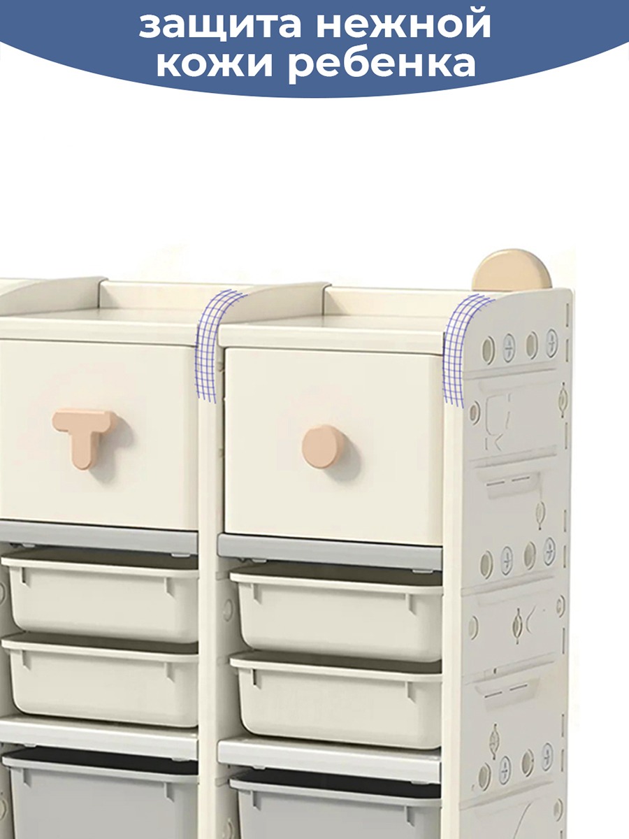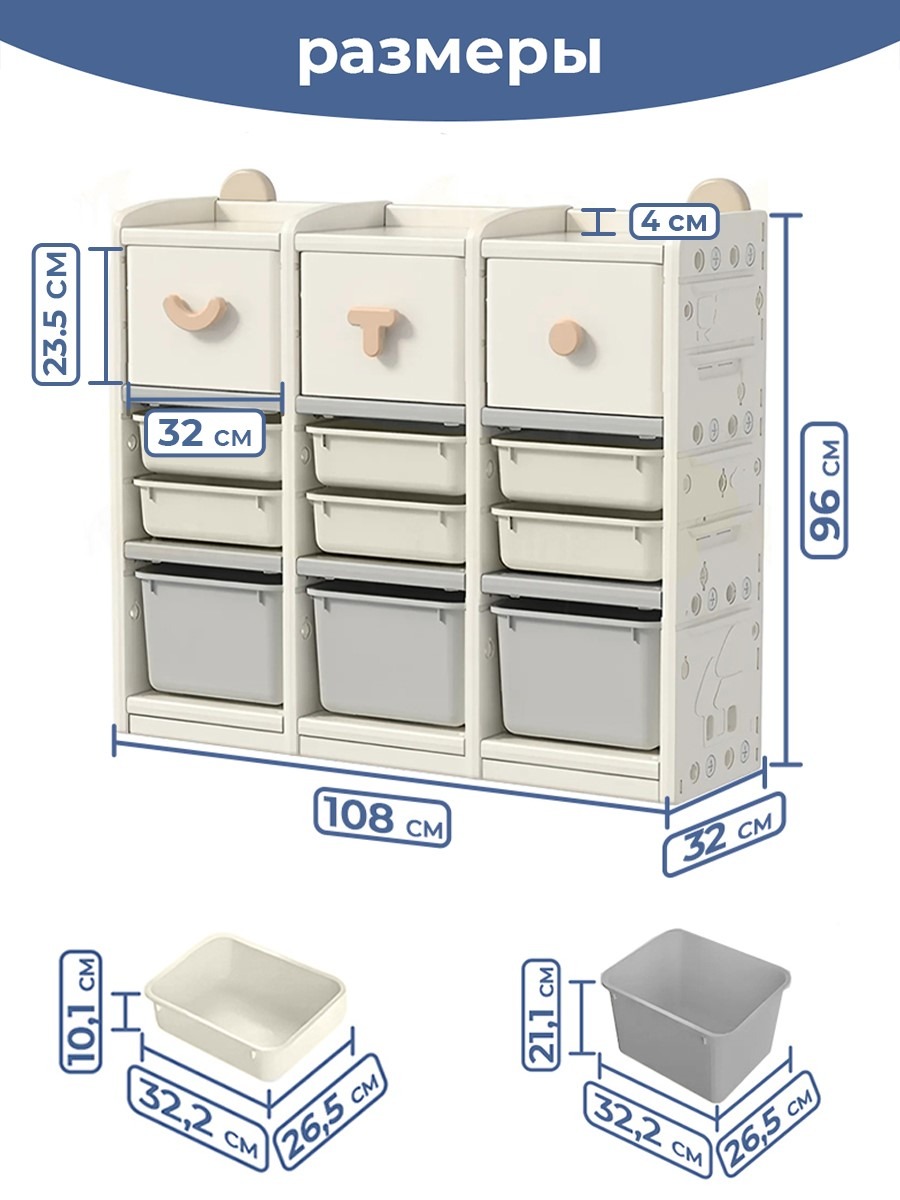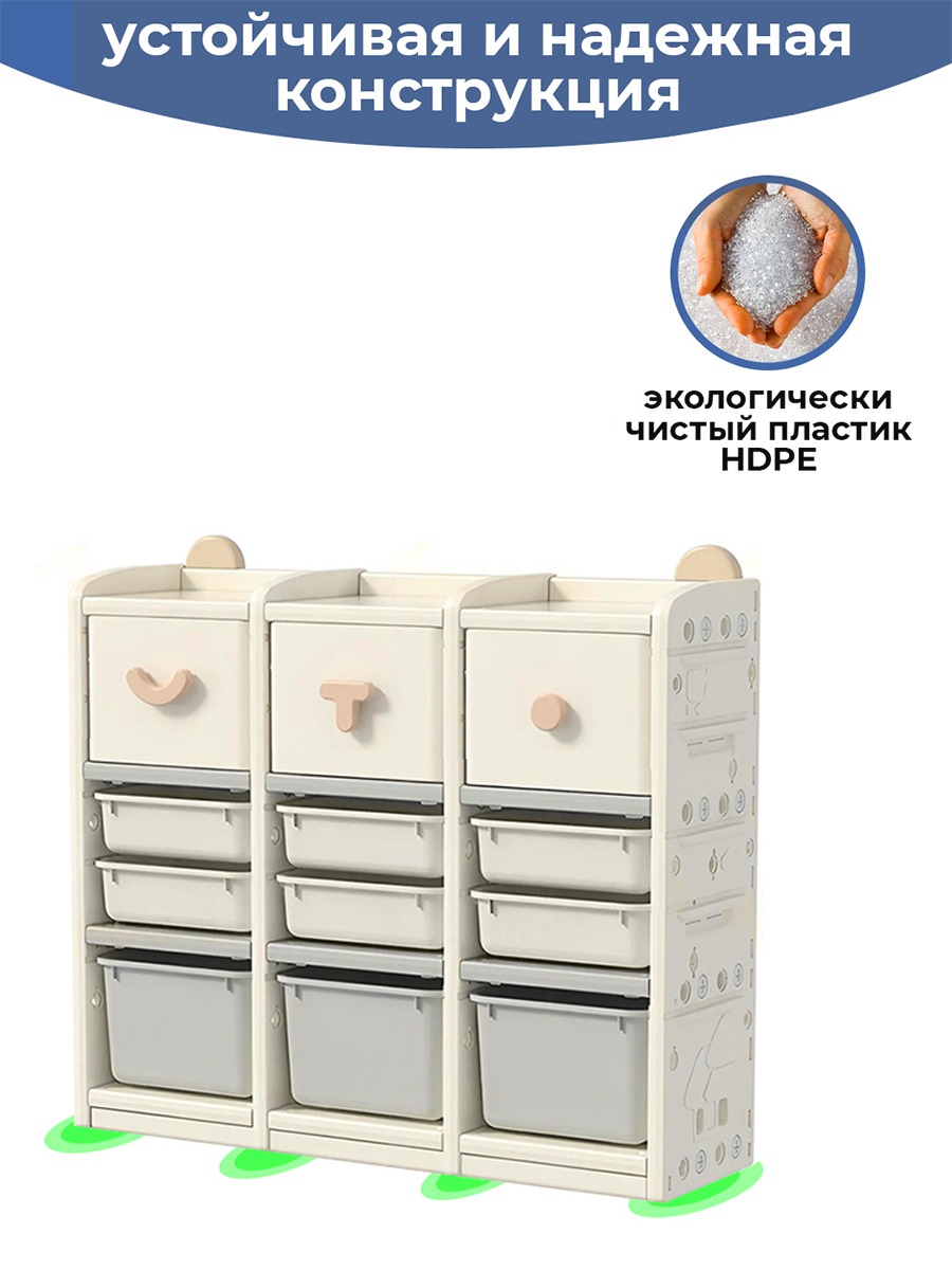 Стеллаж имеет 3 больших ящика (32,2х26,5х21,1см), 6 маленьких (32,2х26,5х21,1см), 3 закрытых полки и 3 открытых. Максимальный вес нагрузки на полку 10 кг. Стеллаж для игрушек легкий в сборке и не занимает много места. Его размер 108х32х96см. Шкаф для игрушек изготовлен из экологически чистого пластика HDPE, имеет закругленные углы, что гарантирует безопасность для вашего ребенка.