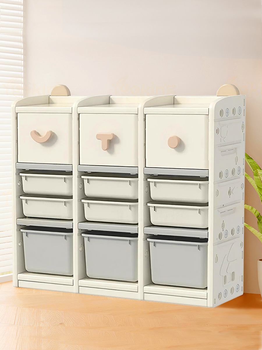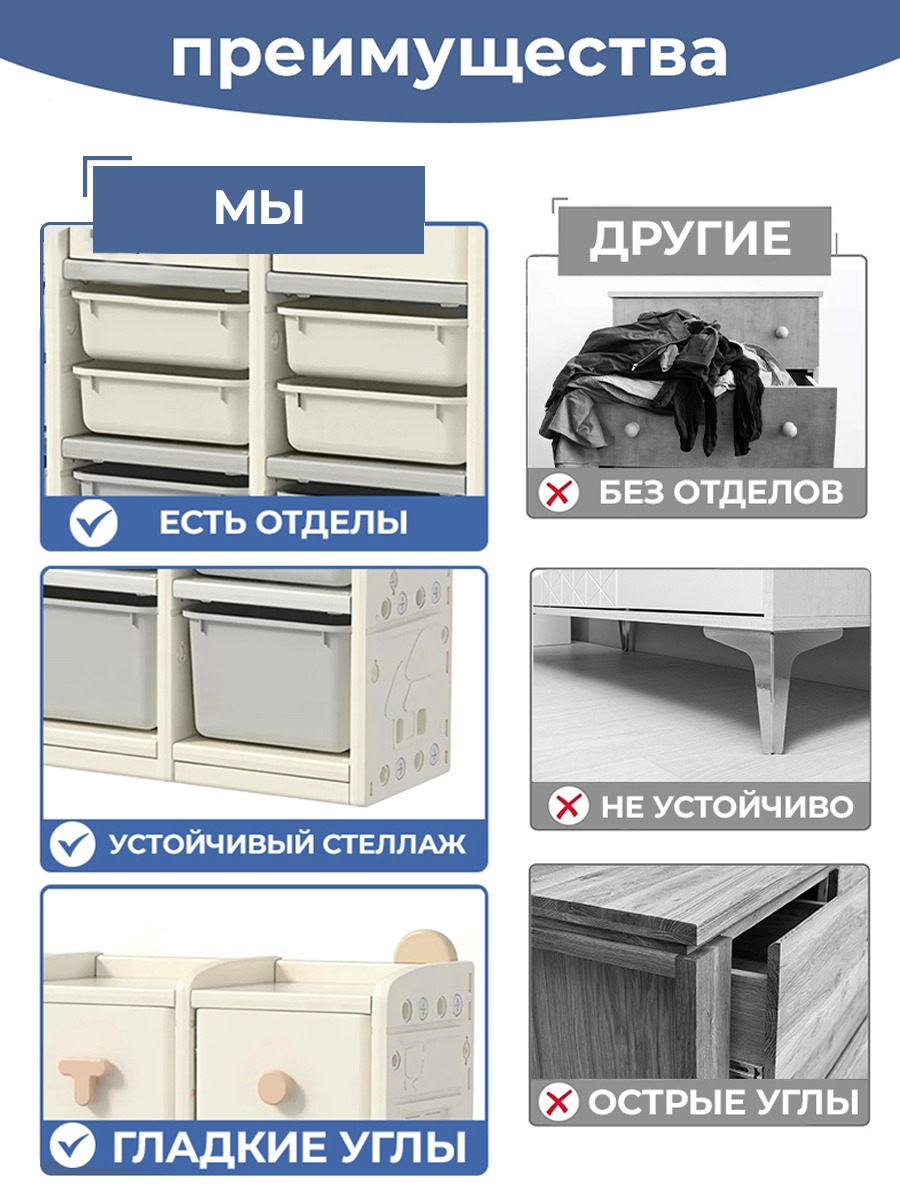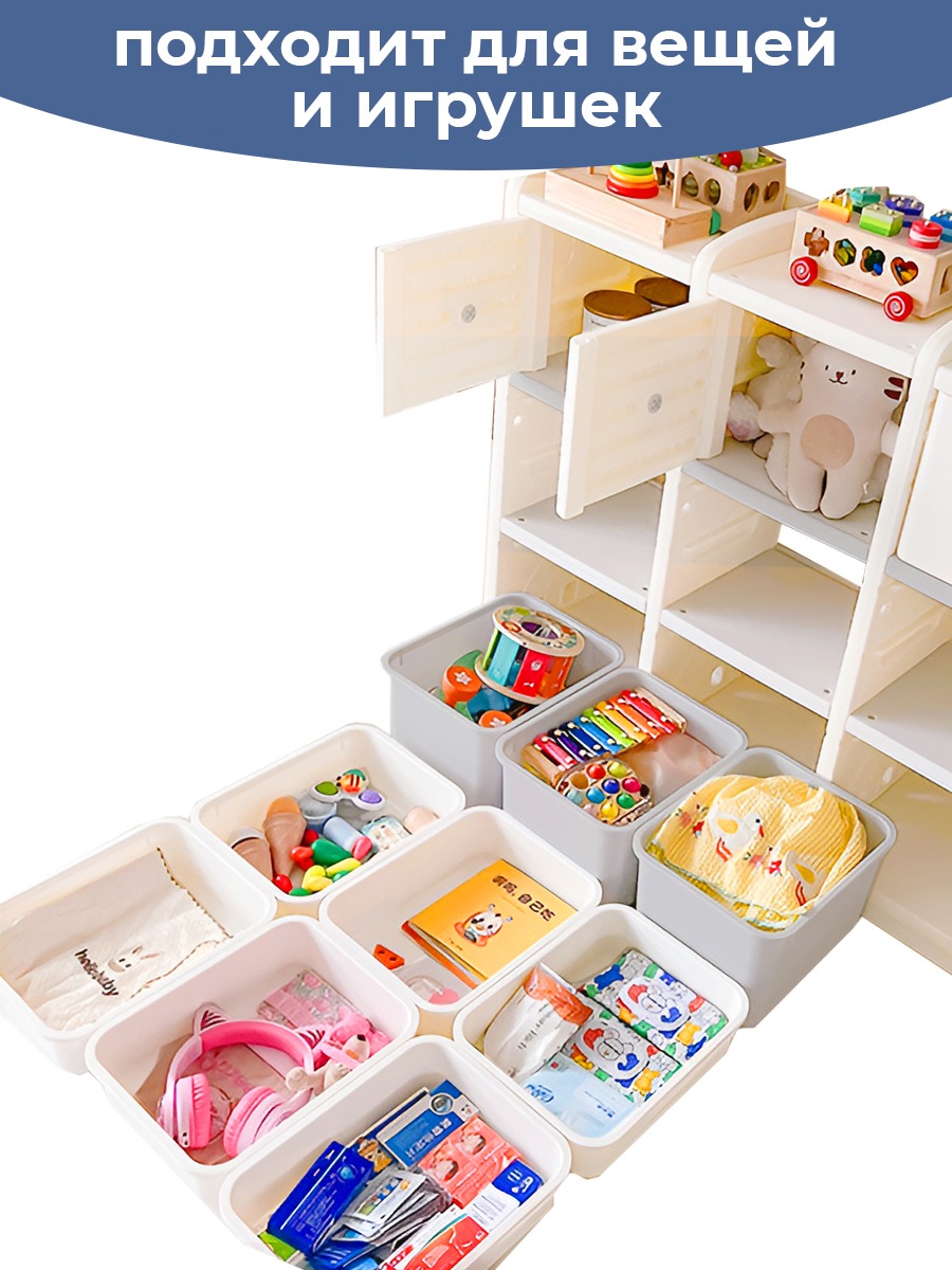 Стеллаж имеет 3 больших ящика (32,2х26,5х21,1см), 6 маленьких (32,2х26,5х21,1см), 3 закрытых полки и 3 открытых. Максимальный вес нагрузки на полку 10 кг. Стеллаж для игрушек легкий в сборке и не занимает много места. Его размер 108х32х96см. Шкаф для игрушек изготовлен из экологически чистого пластика HDPE, имеет закругленные углы, что гарантирует безопасность для вашего ребенка.